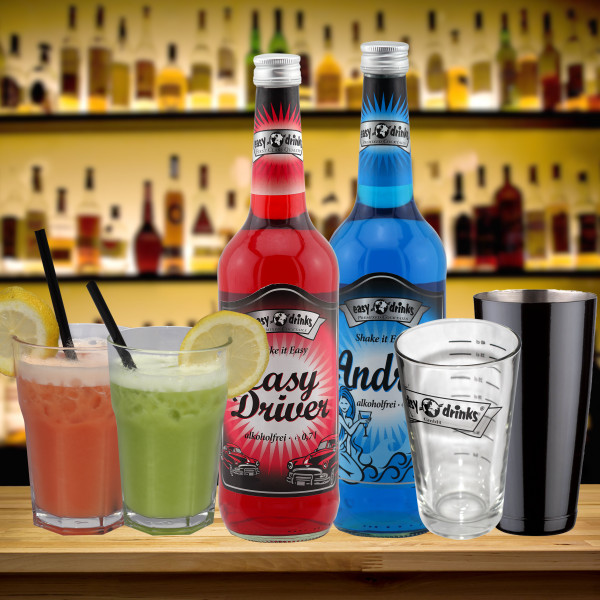 Das Fertigcocktail Set "Shaker / Gläser / Easy Driver & Andrea alkoholfrei" beinhaltet: