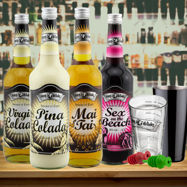 Von der cremigen Exotik der Pina Colada (mit und ohne Alkohol) über den fruchtigen Sommer-Klassiker Sex on the Beach bis hin zum charakterstarken Mai Tai mit 38 % Vol. – dieses Cocktail Set bietet für jeden Geschmack das passende Profil. Die Basis-Spirituosen sind bereits so perfekt ausbalanciert, dass Sie lediglich mit Eis und optionalen Säften auffüllen müssen, um ein Ergebnis wie vom Bar-Profi zu erzielen.